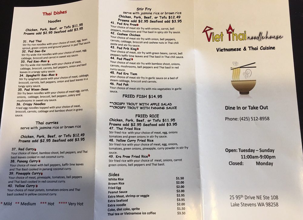 Viet Thai Noodle House is a cozy restaurant located at 25 95th Dr NE Ste 108 in Lake Stevens, WA, specializing in Thai and Vietnamese cuisine. With options for vegan and vegetarian dishes, as well as beer and wine offerings, this spot is perfect for a casual dining experience. The menu features a variety of delicious soups and traditional dishes, all served with excellent waiter service. Whether you're looking for a quick takeout option or a relaxing sit-down meal, Viet Thai Noodle House has you covered. The happy hour specials are a great deal and the atmosphere is welcoming and relaxed. Don't miss out on trying their flavorful dishes!
